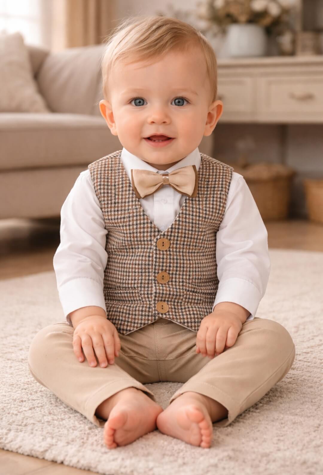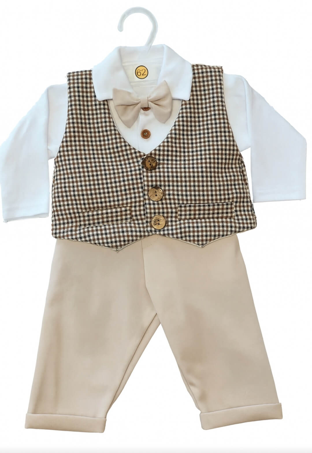 Stylowa kamizelka w brązową pepitkę oraz elegancka muszka tworzą wyjątkowy zestaw.