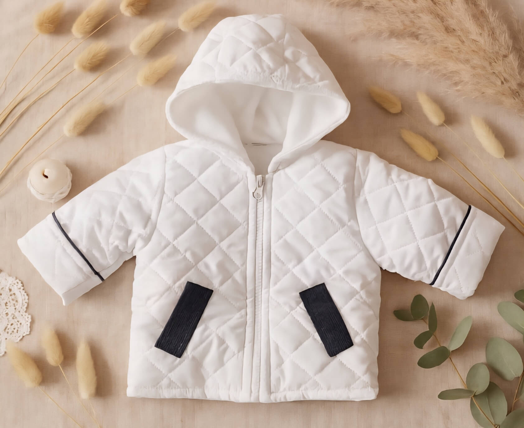Biała pikowana kurtka z kapturem, efektownie wykończona granatowymi wstawkami.